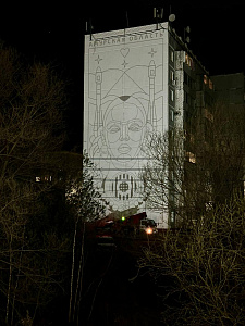 Работы уже начались — этой ночью на фасад дома № 6 в поселке Аэропорт художник-монументалист Павел Орез уже начал наносить многометровое изображение.
